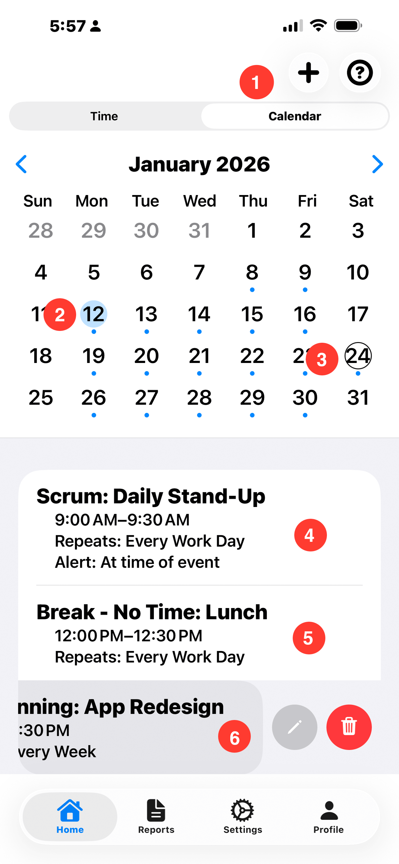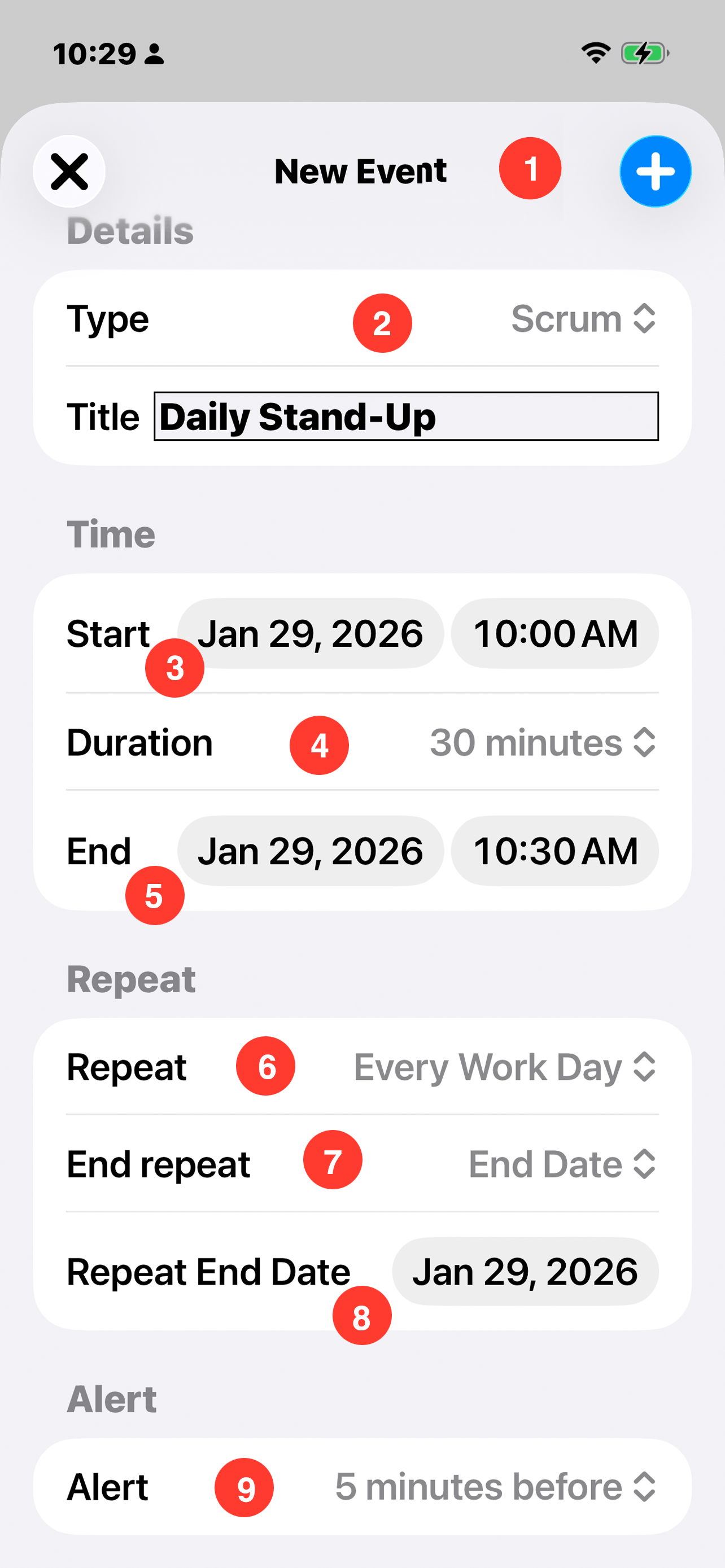 - 1. Add: Plus Sign Button: Tap to create a new event.