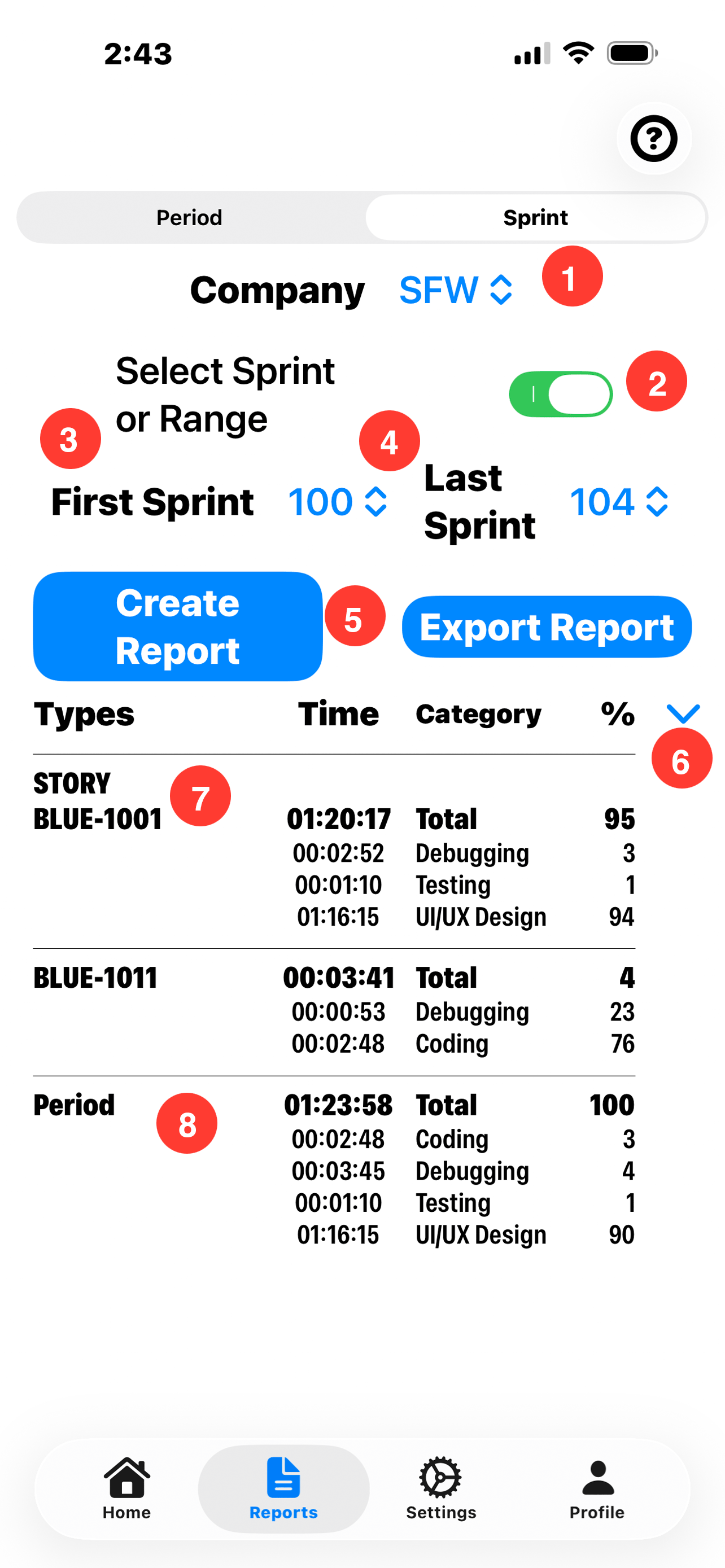 - 8. Period Section: This section has the time for all tasks in the Sprint. Note it's percentage is always a total of 100%. The detail section has the time for each category worked on during that sprint.