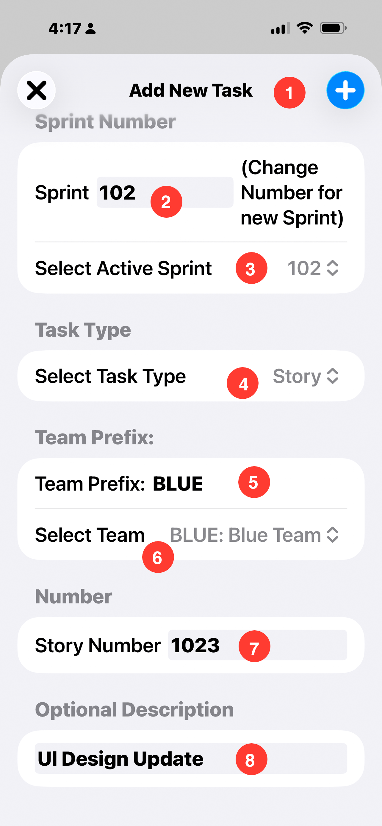- 4. Plus Sign Button: Tap to create a new task or story.